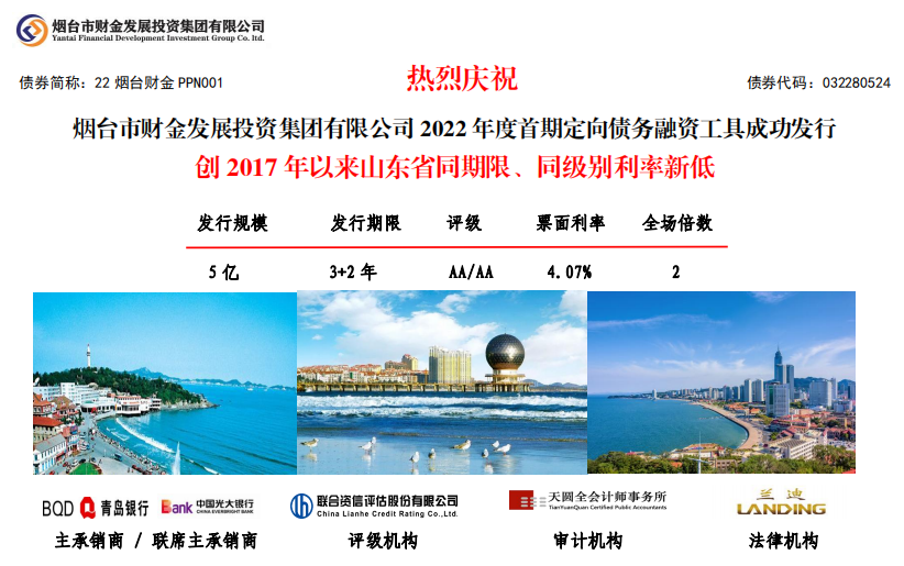 6月8日,yl23455永利集团官网集团2022年度首期定向债务融资工具(PPN)在中国银行间市场交易商协会成功发行!发行规模5亿元,期限3+2年,票面利率4.07%,全场认购倍数2倍,创2017年以来山东省同期限、同级别利率新低。本期债券发行由青岛银行牵头主承,光大银行联席主承,联合资信、天圆全会计师事务所及兰迪律师事务所分别提供信用评级、审计和法律服务。
