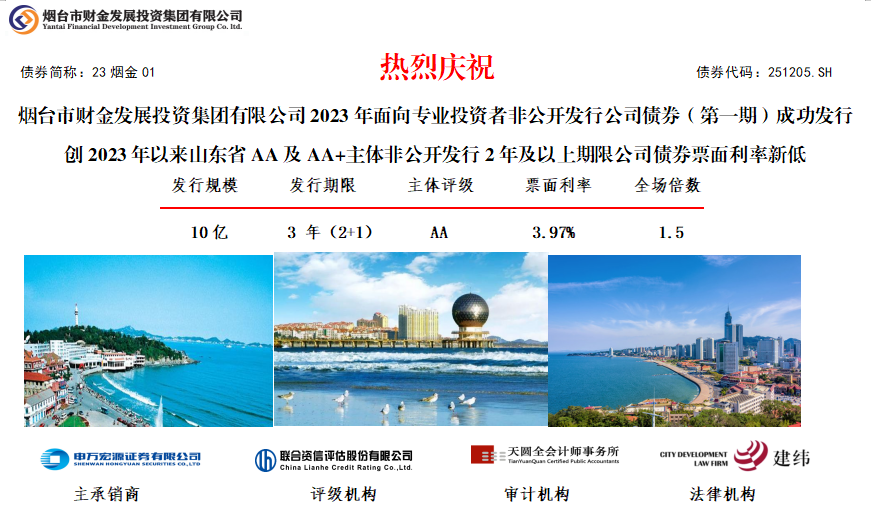 6月6日,yl23455永利集团官网集团2023年面向专业投资者非公开发行公司债券(第一期)成功发行。本期债券发行规模10亿元,期限3年(2+1),票面利率3.97%,全场认购倍数1.5倍,集团作为AA主体,创2023年以来山东省所有AA、AA+主体非公开发行2年及以上期限公司债券票面利率新低,且票面利率低于山东省2023年以来同级别、同期限非公开公司债253BP以上。本期债券发行由申万宏源证券有限公司主承,联合资信、天圆全会计师事务所及建纬律师事务所分别提供信用评级、审计和法律服务。