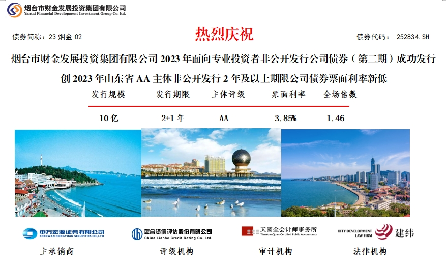 10月24日,yl23455永利集团官网集团2023年面向专业投资者非公开发行公司债券(第二期)在上交所成功发行!本期债券发行规模10亿元,期限3年(2+1),票面利率3.85%,全场认购倍数1.46倍,创2023年山东省AA主体非公开2年及以上期限公司债券票面利率新低,也是集团继6月成功发行“23烟金01”公司债券后,半年内再次刷新山东地区同级别同期限非公开发行公司债券最低利率记录。本期债券发行由申万宏源证券有限公司主承,联合资信、天圆全会计师事务所及建纬律师事务所分别提供信用评级、审计和法律服务。