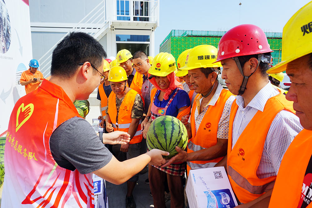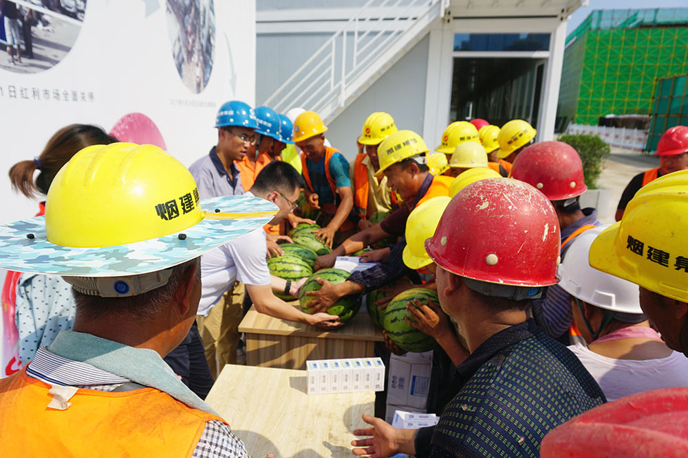 眼下,虽已立秋,但持续的高温天气,让建设工地的工人们仍顶着炎炎烈日,挥汗如雨,迎战“烤”验。为促进一线工人身心健康,实现工地安全生产,8月18日上午,财政监管市属国有企业“红色先锋”党建联盟一行20名党员代表,来到芝罘湾广场建设工地,组织开展了“进工地送清凉”活动,为工人们送上西瓜、矿泉水、药品等降暑物品,向坚守在高温下的一线工人送去清凉和关怀。